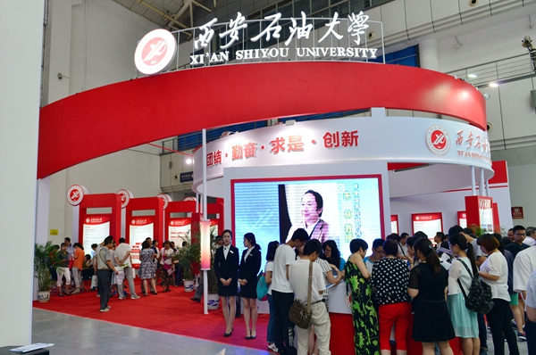 我校展区位于曲江国际会展中心核心展区A馆。展台设计采用彩色图文展板、实物展品、LED显示、宣传彩页等多种形式,对我校65年来办学历史,尤其是近年来我校在教学科研、人才培养、国际教育交流与合作等方面取得的成绩进行了全方位展示,突出了石油石化特色。为做好招生咨询服务,各院(系)教师代表、招生办公室工作人员、学生志愿者纷纷为前来咨询的家长和学生提供信息咨询服务。