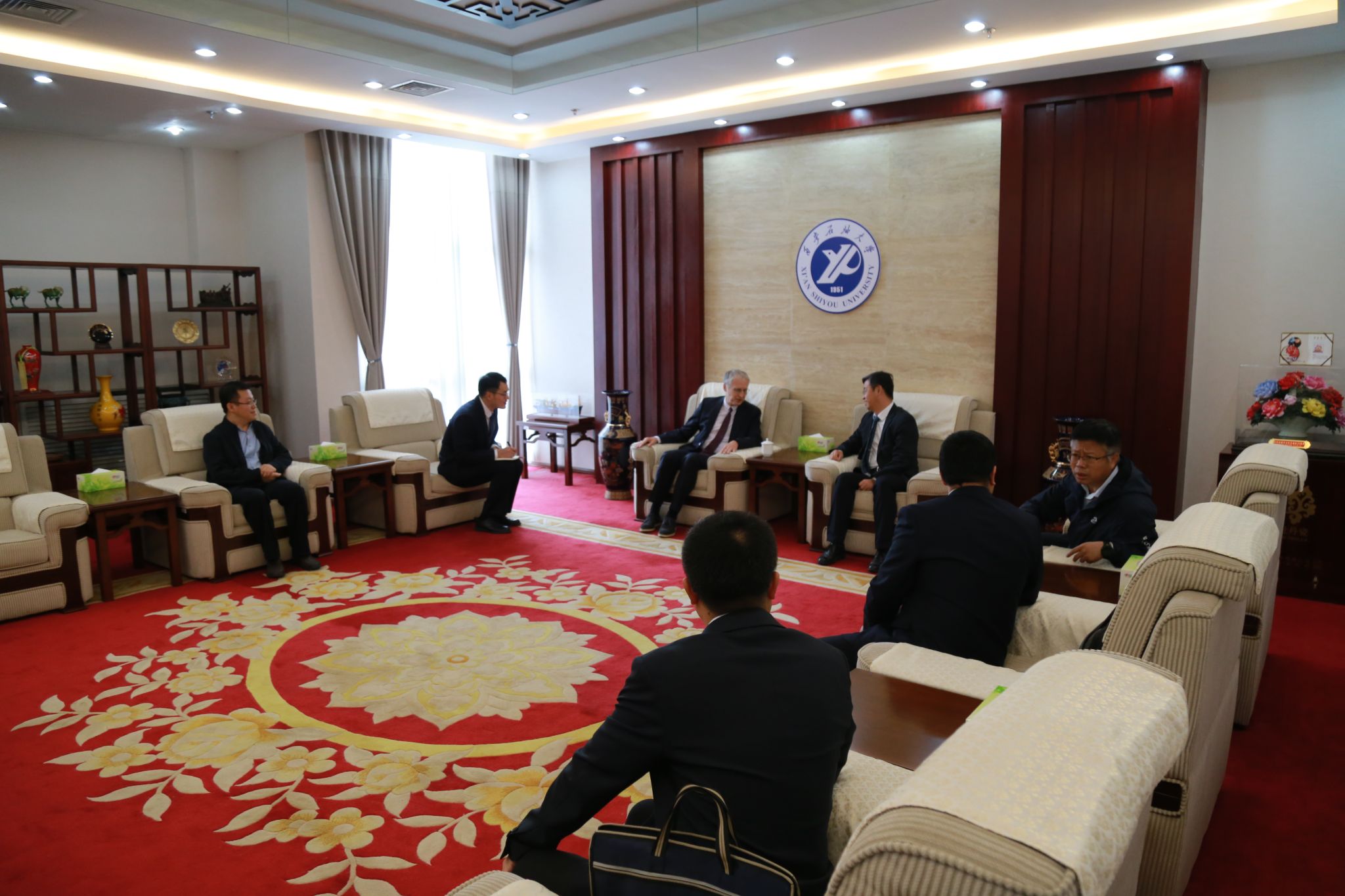 报告会前,校长王进富在鄠邑校区图书馆接待室会见舍恩伯格教授。副校长张骁勇参加会见。